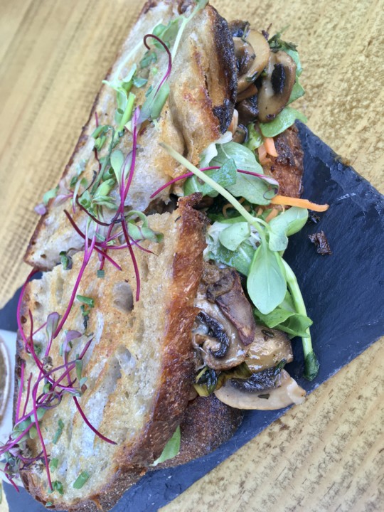 O m-R resolveu matar saudades de Fish and Chips, com bom bacalhau fresco, um polme crocantes, mas as batas demasiado finas e queimadas; e eu pedi uma sanduíche de cogumelos em pão artesanal de cerveja: muito grandinha, muito bem servida, vegetariana, tudo de bom para um jantar leve.
